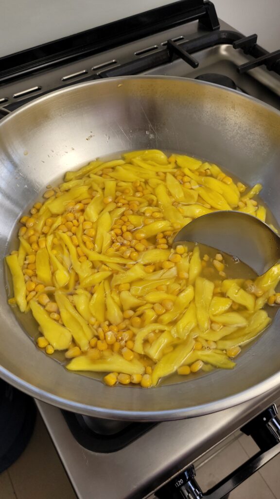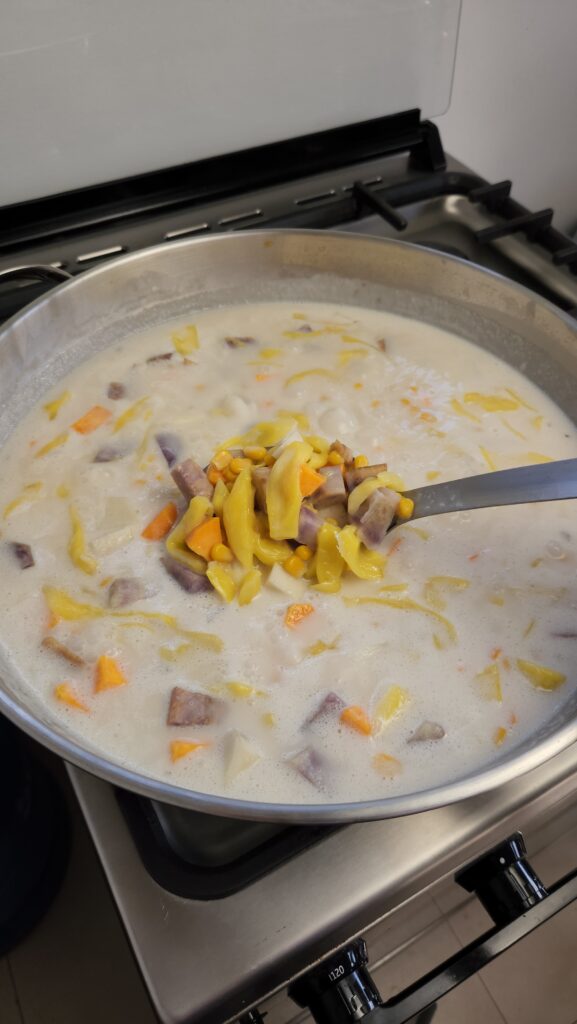 • In a large pot, combine whole kernel corn with syrup, shredded rice jackfruit, water, sugar, taro root, camote root, ube root, coconut milk and 1 tsp of salt bring to a gentle boil and simmer until slightly tender.