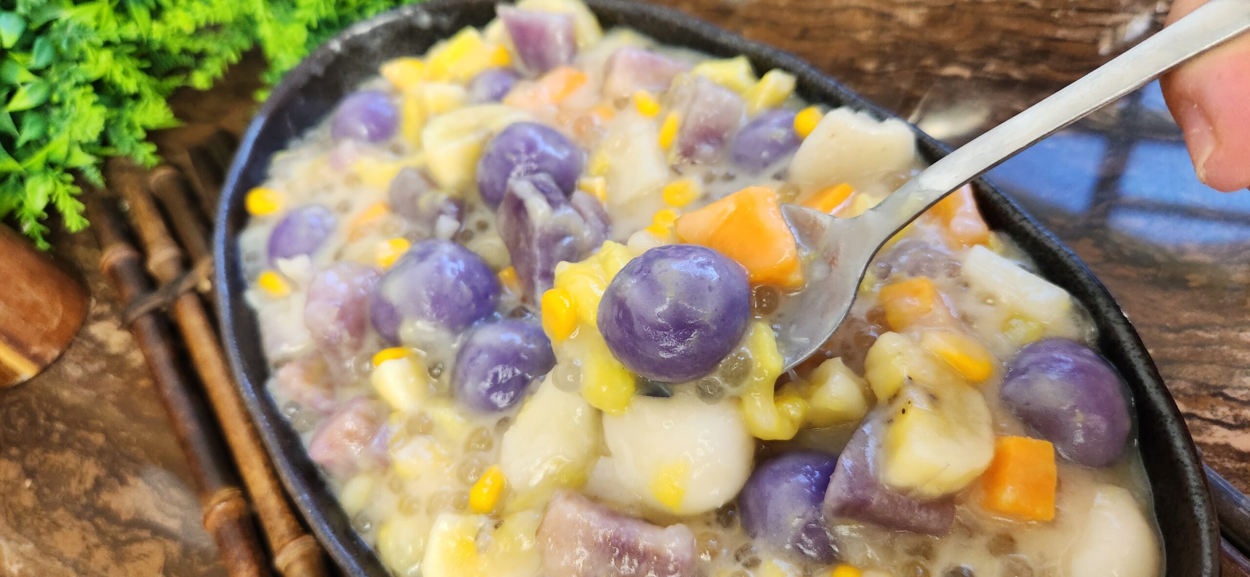 A warm, comforting Filipino dessert made with chewy rice balls, coconut milk, fruits, and root crops—perfect for merienda or rainy days.
