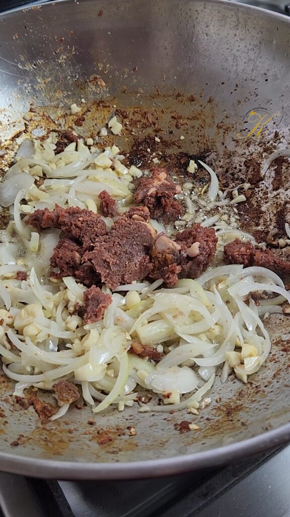 - Add shrimp paste and stir-fry for 1–2 minutes.