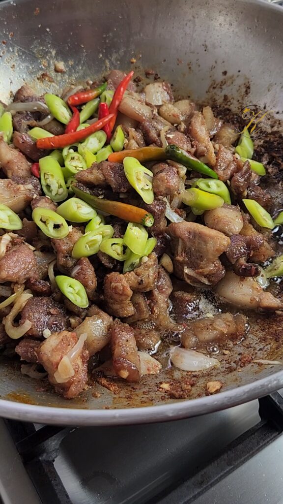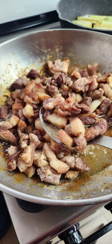 - Allow water to evaporate, then add 1–2 tbsp oil and fry pork until golden brown. Set aside.