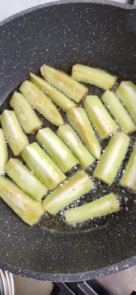 - In the same pan or a separate pan, fry eggplant slices until browned. Drain on paper towels and set aside.