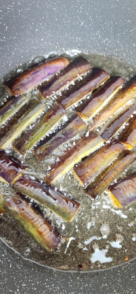 • Fry eggplants separately to keep them from becoming mushy when added to the pork.