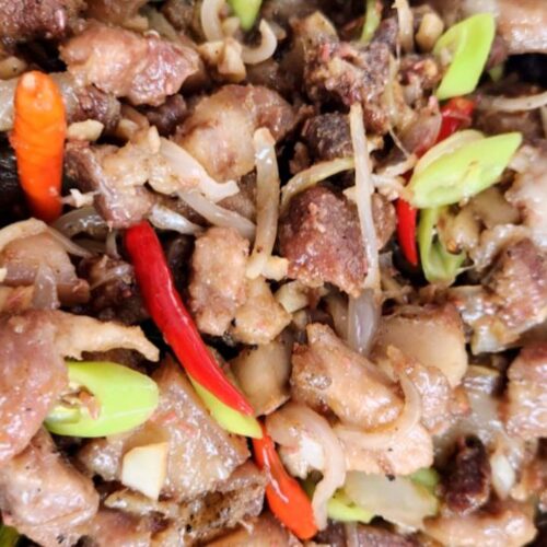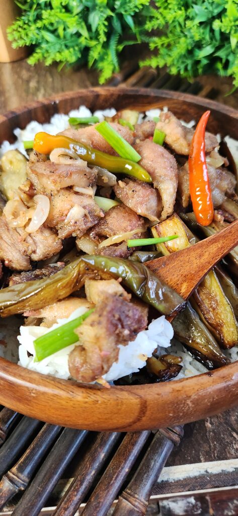 A rich, savory-salty Filipino dish made with crispy pork belly and shrimp paste, paired with fried eggplant and chilies for a flavorful kick.