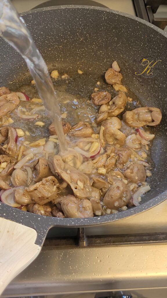 - Pour in water, season with salt and liquid seasoning, then cover and simmer until the gizzard is tender.