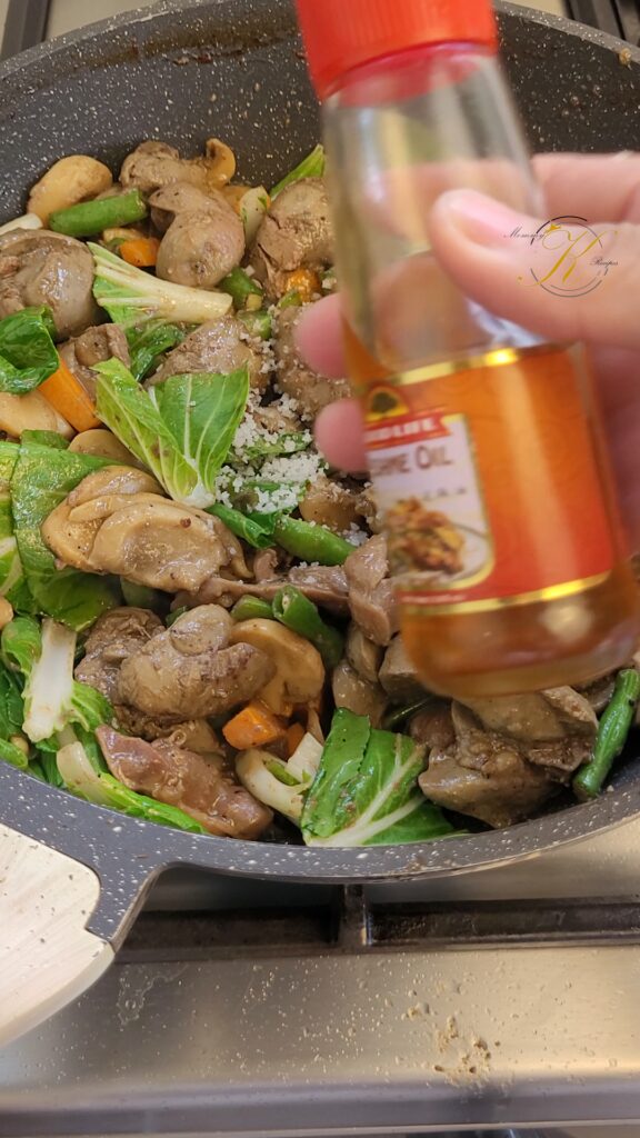 - Return the fried liver to the pan. Add bokchoy leaves, sesame oil, and pepper. Toss well until everything is coated and cooked through.