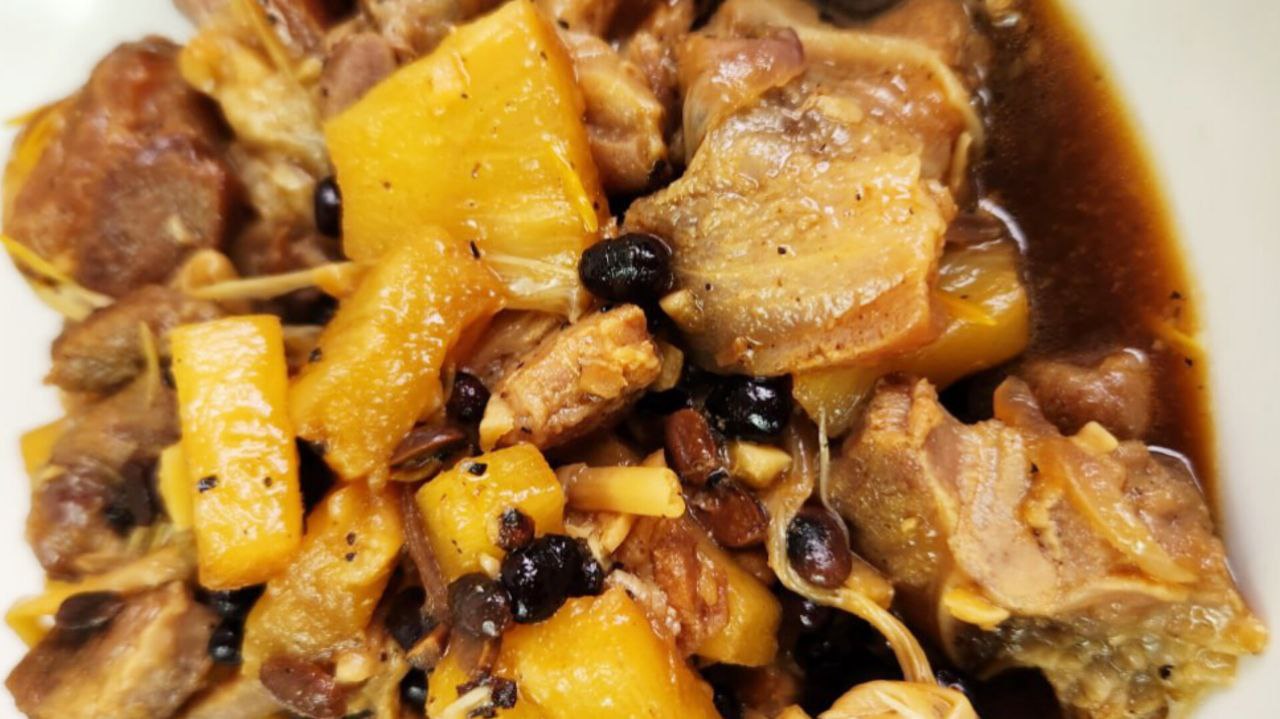 A sweet-savory Filipino braised pork belly dish with pineapple, black beans, and aromatic spices.