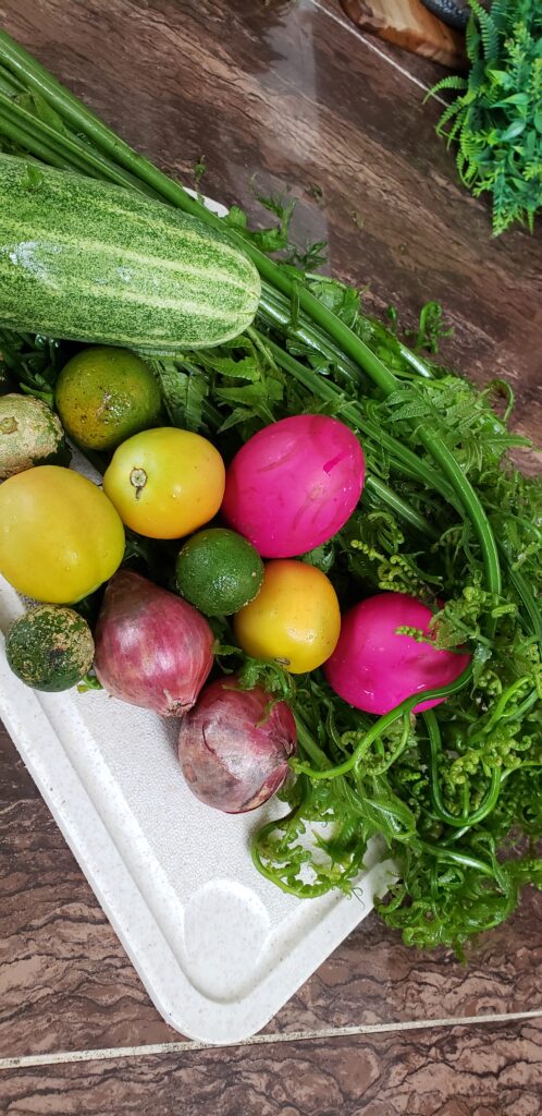 - In a large bowl, combine pako, cucumber, onion, and tomatoes.