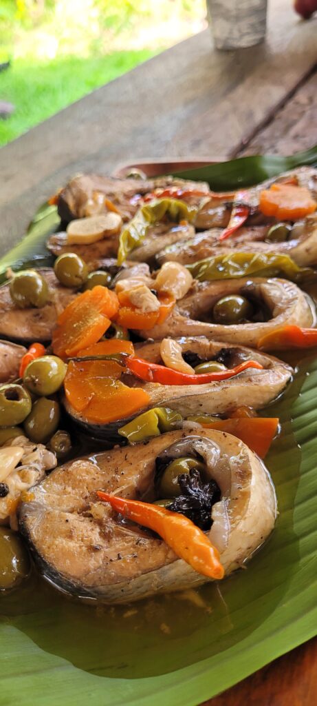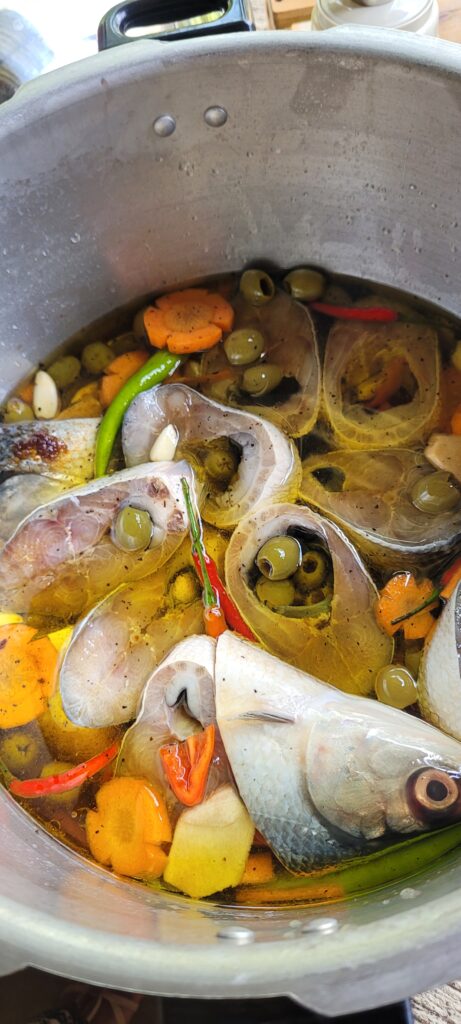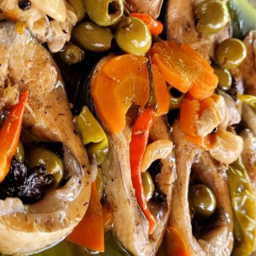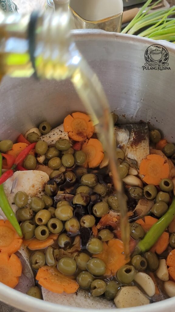 A rich and savory Filipino-Spanish fusion dish featuring bangus (milkfish) simmered in olive oil with spices and aromatics for a flavorful, tender result.